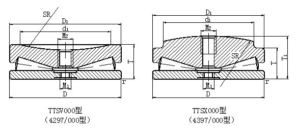 該類軸承是專用軸承,是為軋鋼機(jī)壓下機(jī)構(gòu)專門設(shè)計的,軸承無保持架滿裝滾子,允許的轉(zhuǎn)速極低,軸向負(fù)荷能力很大,為滿足軋鋼機(jī)壓下機(jī)構(gòu)工作要求,該類軸承的頂圈頂端加工成凸球面TTSX000型(4297/000型)或凹球面TTSV000型(4397/000型),以保證其調(diào)心性能,同其他相配合的異型端面接觸均勻,在壓下機(jī)構(gòu)相對軸承軸線產(chǎn)生一定傾斜時能保證軸承受力均勻。